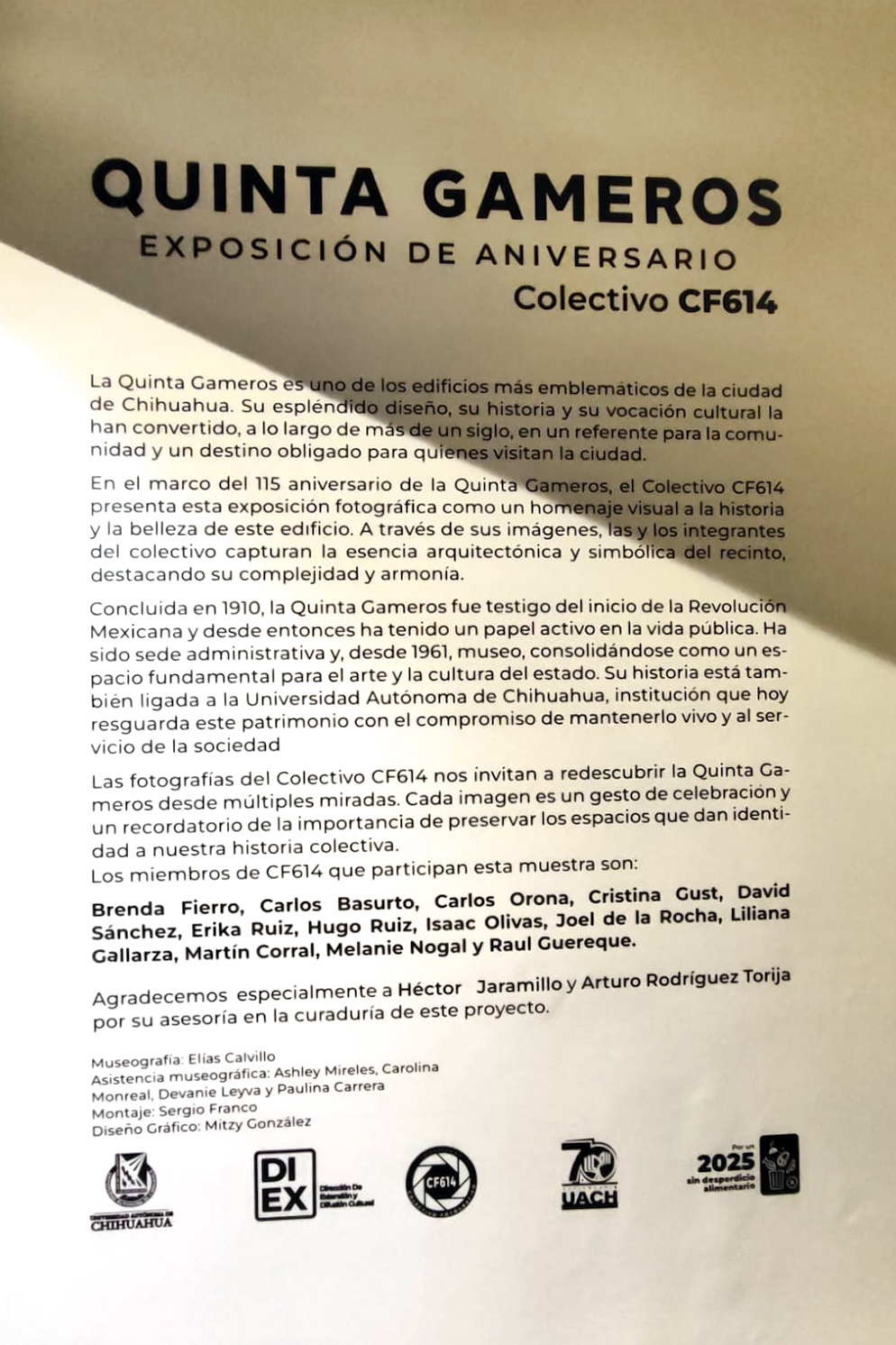 Queremos expresar nuestro más sincero agradecimiento a la familia y amigos que siempre nos brindan su apoyo incondicional. Asimismo, extendemos un especial reconocimiento a los representantes de la institución Quinta Gameros, quienes nos otorgaron todas las facilidades para montar esta exposición en un espacio tan emblemático y lleno de significado para la ciudad en el marco del Aniversario 115 de la Quinta.